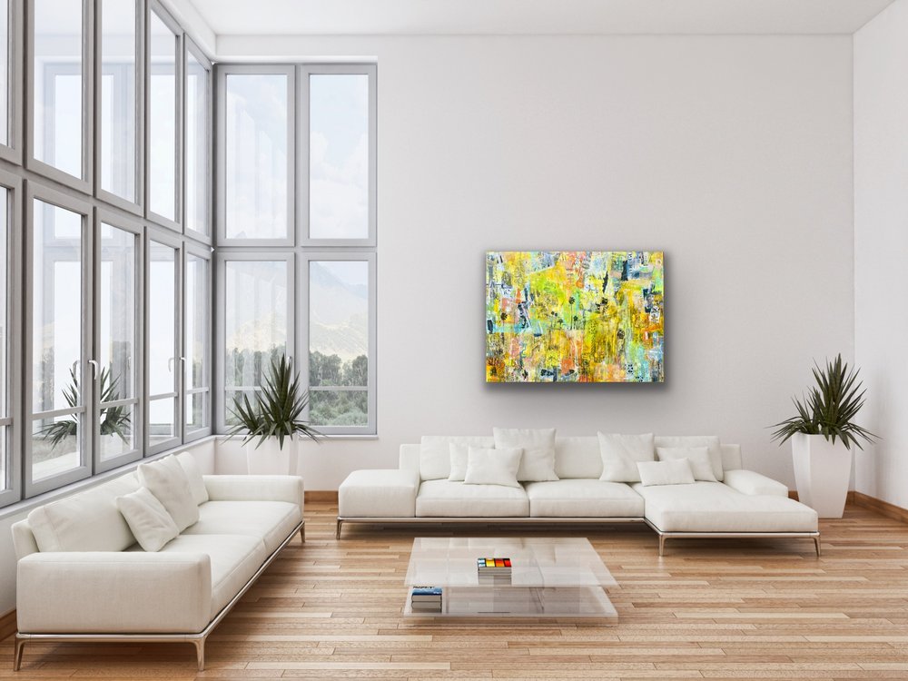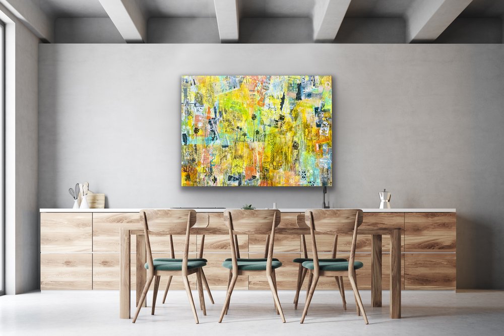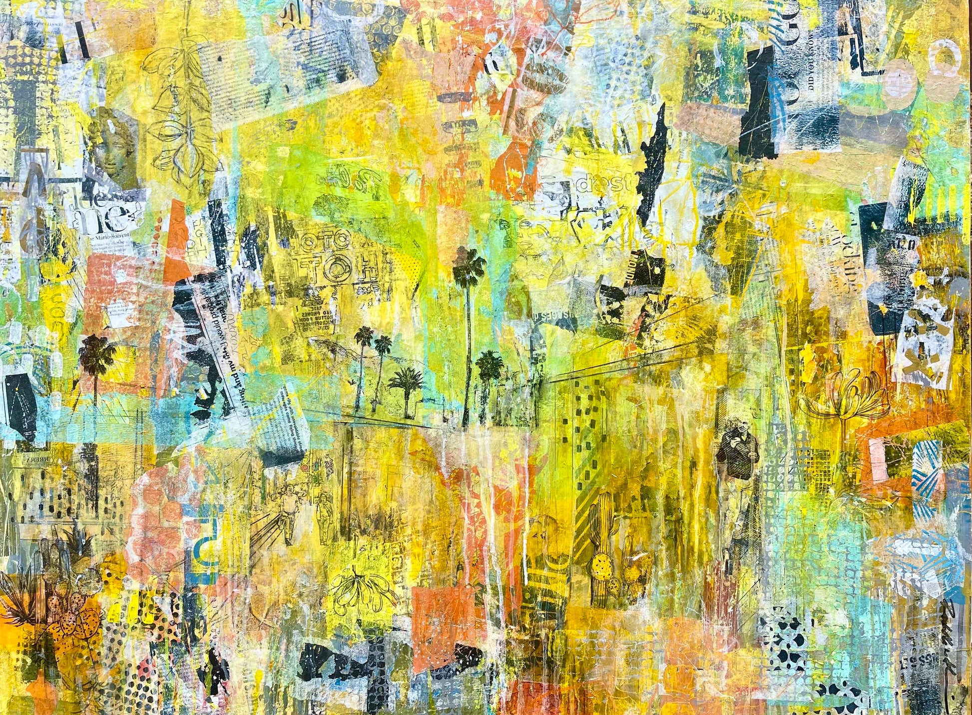 I used hand-printed collage papers, photo transfers, inks, acrylic, and graphite to create this 40x30” mixed media collage painting. It has several layers of paint and paper and embedded imagery.