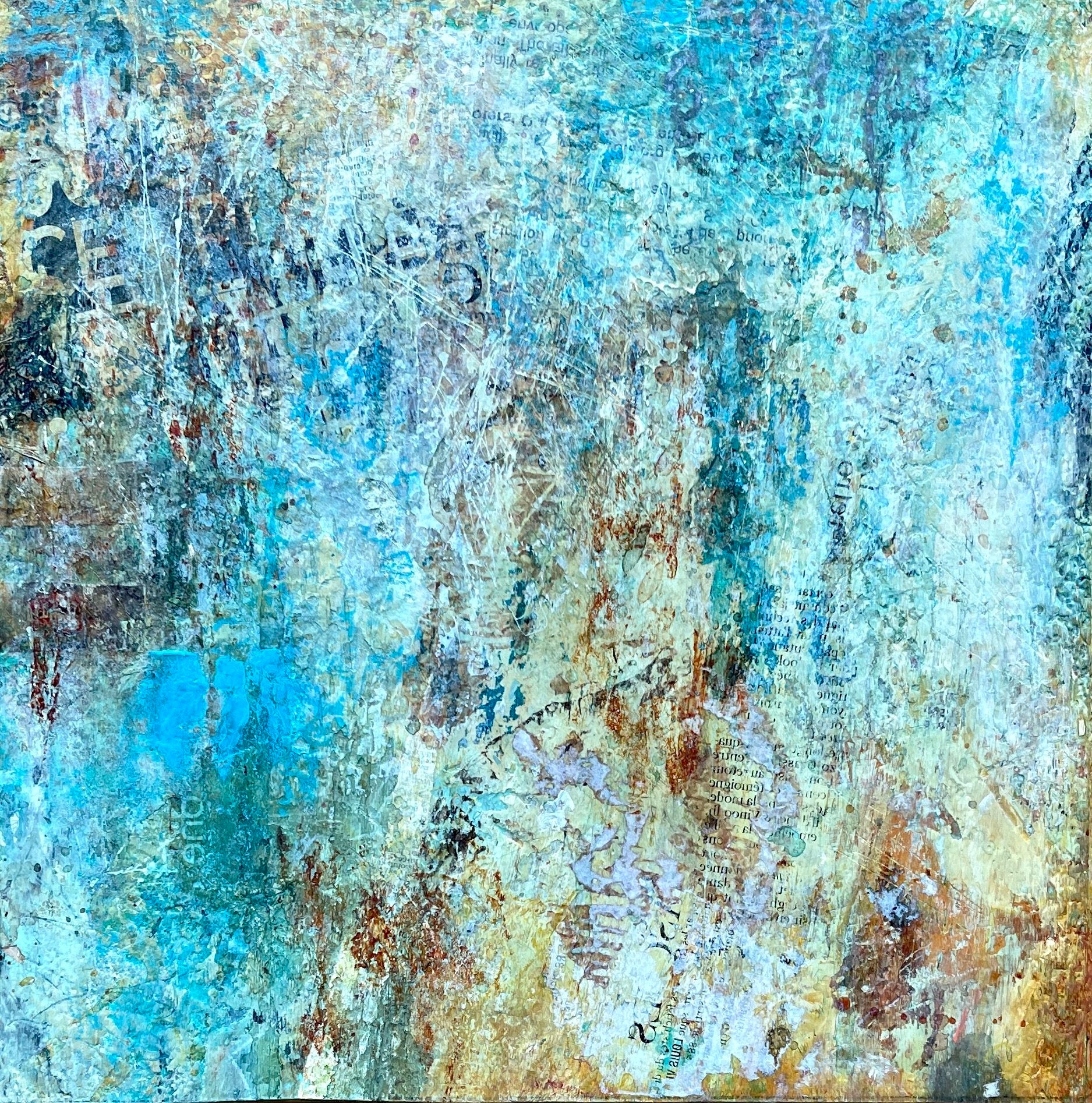 mixed media painted on heavy archival paper and mounted on wooden panel. It has rich colors, textures and mark makings. Layers of paint, hand printed papers and text from vintage magazines. This piece is reminiscent of an old wall in a forgotten city.