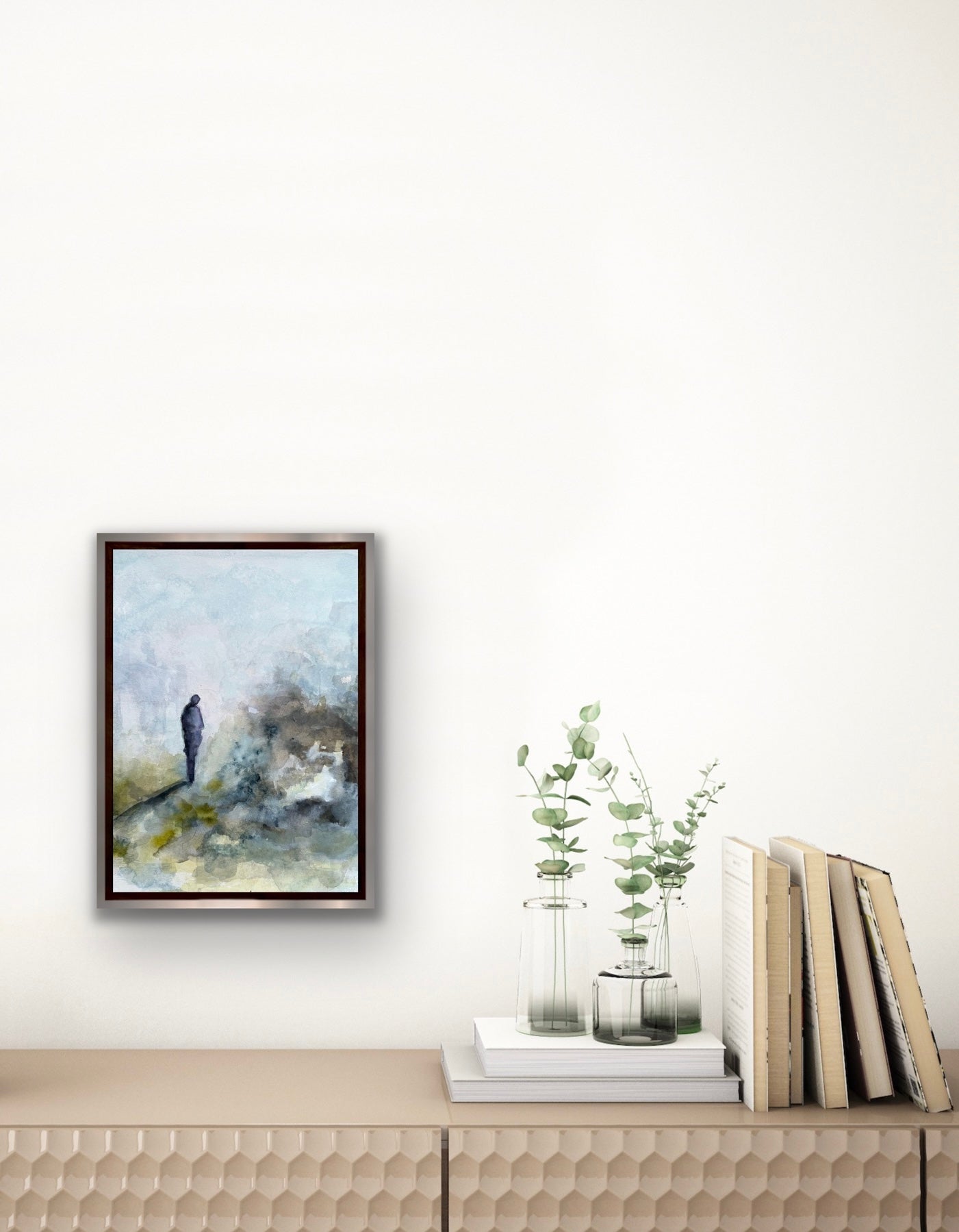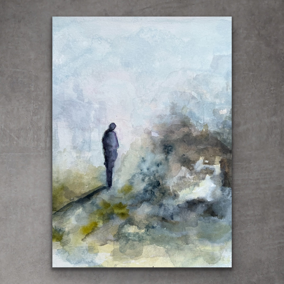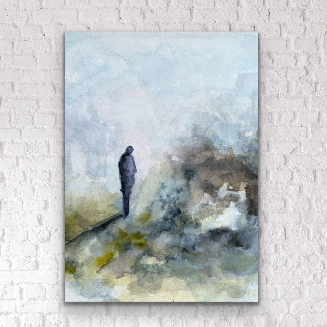 This piece is part of my new series of figurative work. Stepping into stillness and embracing the quiet within. This piece ventures away from my vibrant and lively paintings. Layers of earthy hues wash the background, evoking a tranquil vibe. The solitary figure embodies the quest for identity in an unfamiliar space—separation, anticipation, and the longing for fresh beginnings. It’s a moment to exhale, reflect on transformation, and gaze ahead at the horizon of hope.