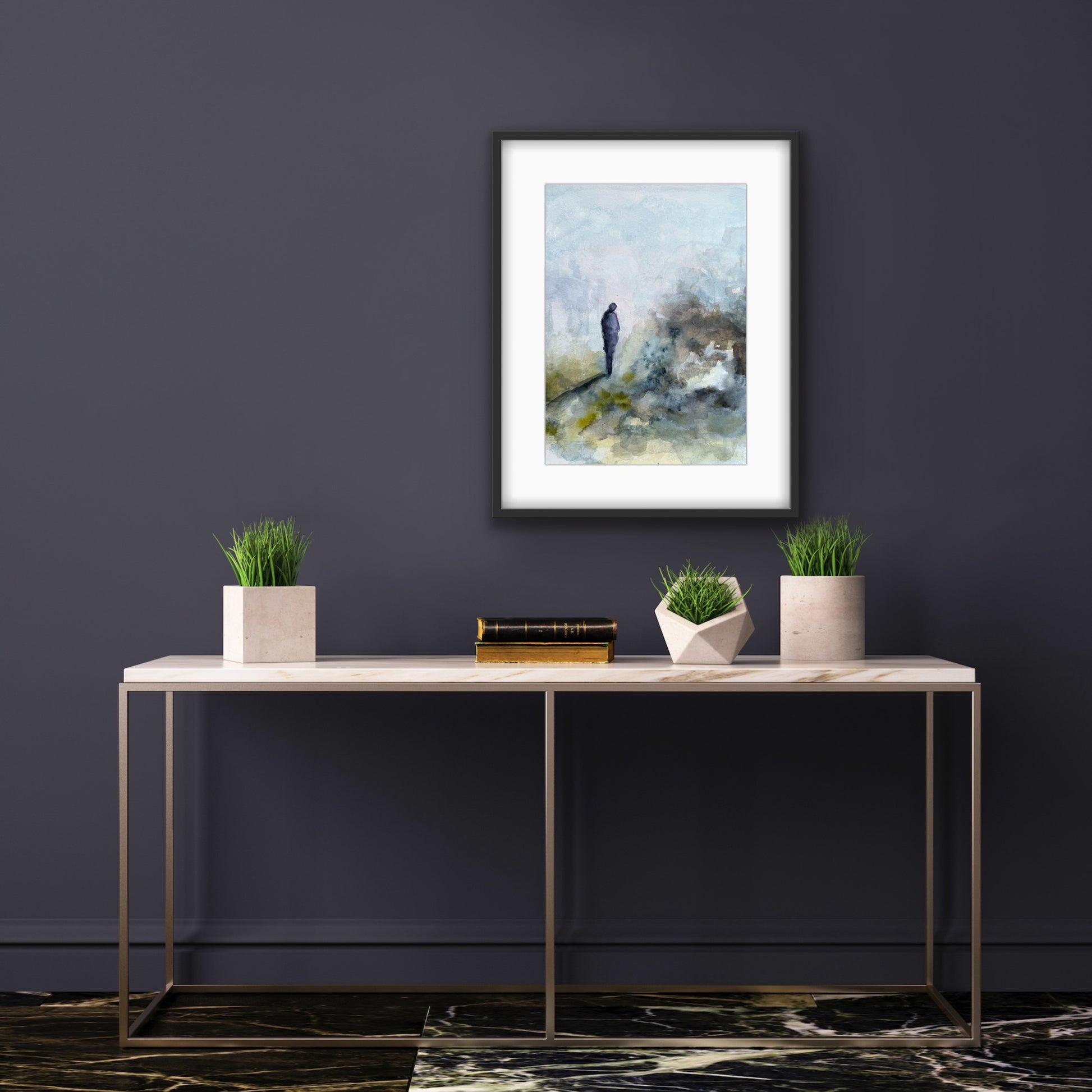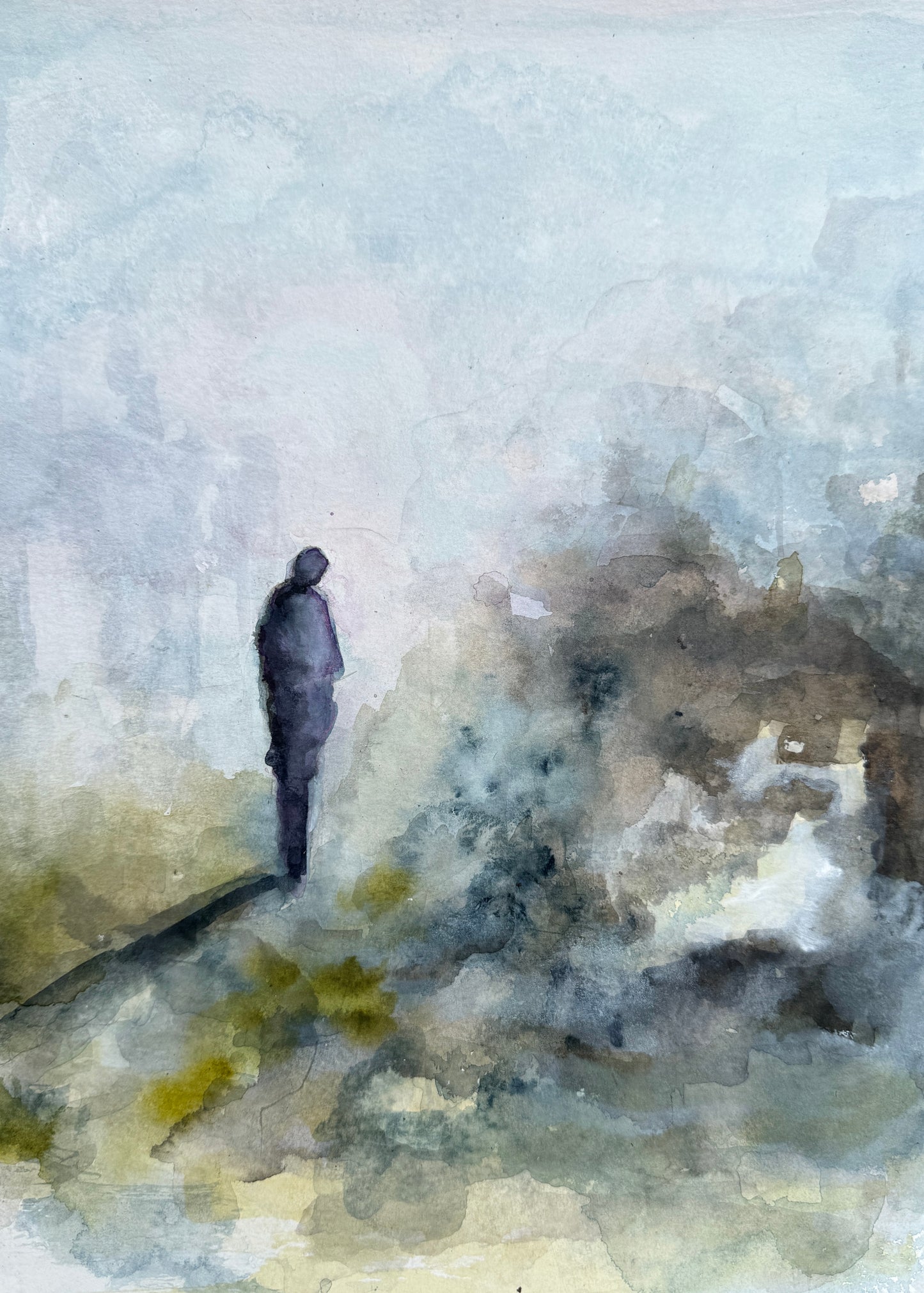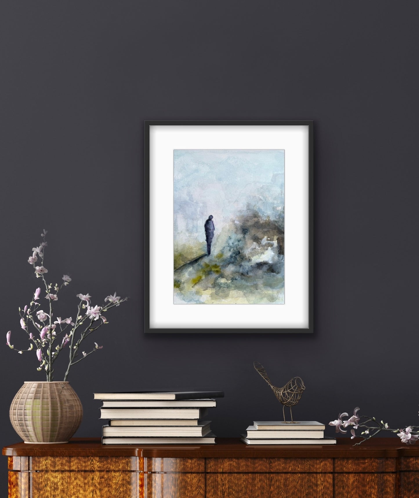 This piece is part of my new series of figurative work. Stepping into stillness and embracing the quiet within. This piece ventures away from my vibrant and lively paintings. Layers of earthy hues wash the background, evoking a tranquil vibe. The solitary figure embodies the quest for identity in an unfamiliar space—separation, anticipation, and the longing for fresh beginnings. It’s a moment to exhale, reflect on transformation, and gaze ahead at the horizon of hope.
